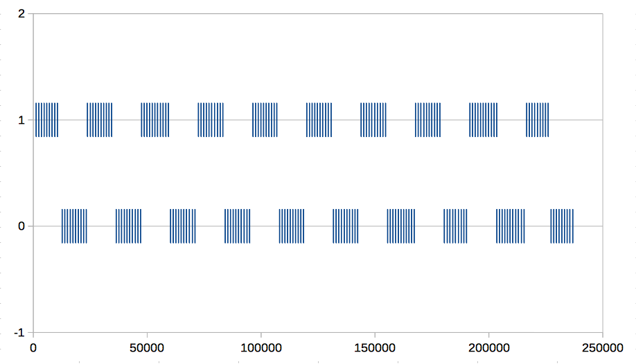ただ一つ存在するp0が常に動作しています。total引数で指定した通り、およそ100ms後に全ての処理が終わります。これについては、仕事量見積もりの誤差やデータ測定のオーバーヘッドなどの理由によって、ちょうど100ms後にするのはなかなか難しいですが、頑張ればこの誤差はある程度は減らせます。興味のあるかたは後述の参考資料をごらんください。