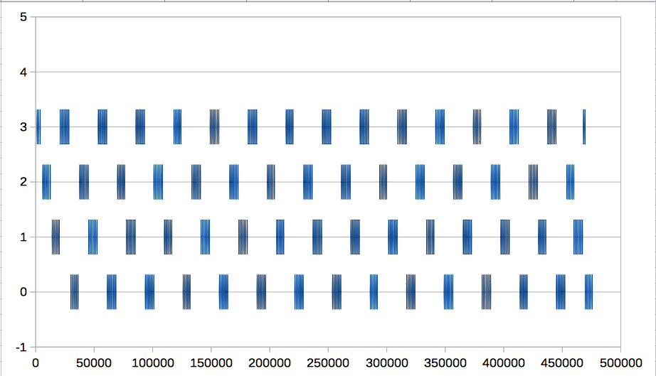 - CPU上で動作中のプロセス: 横軸は開始時点からの経過時間[us]。縦軸はプロセスの番号(0-3)
