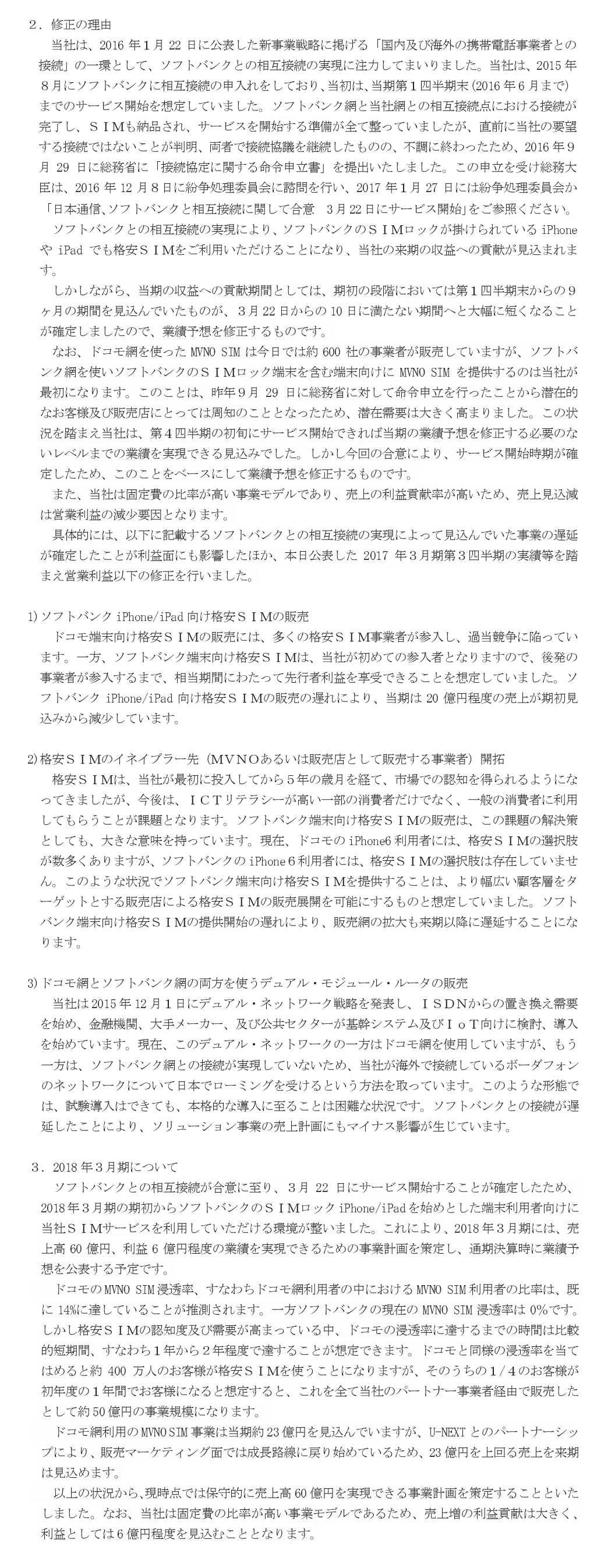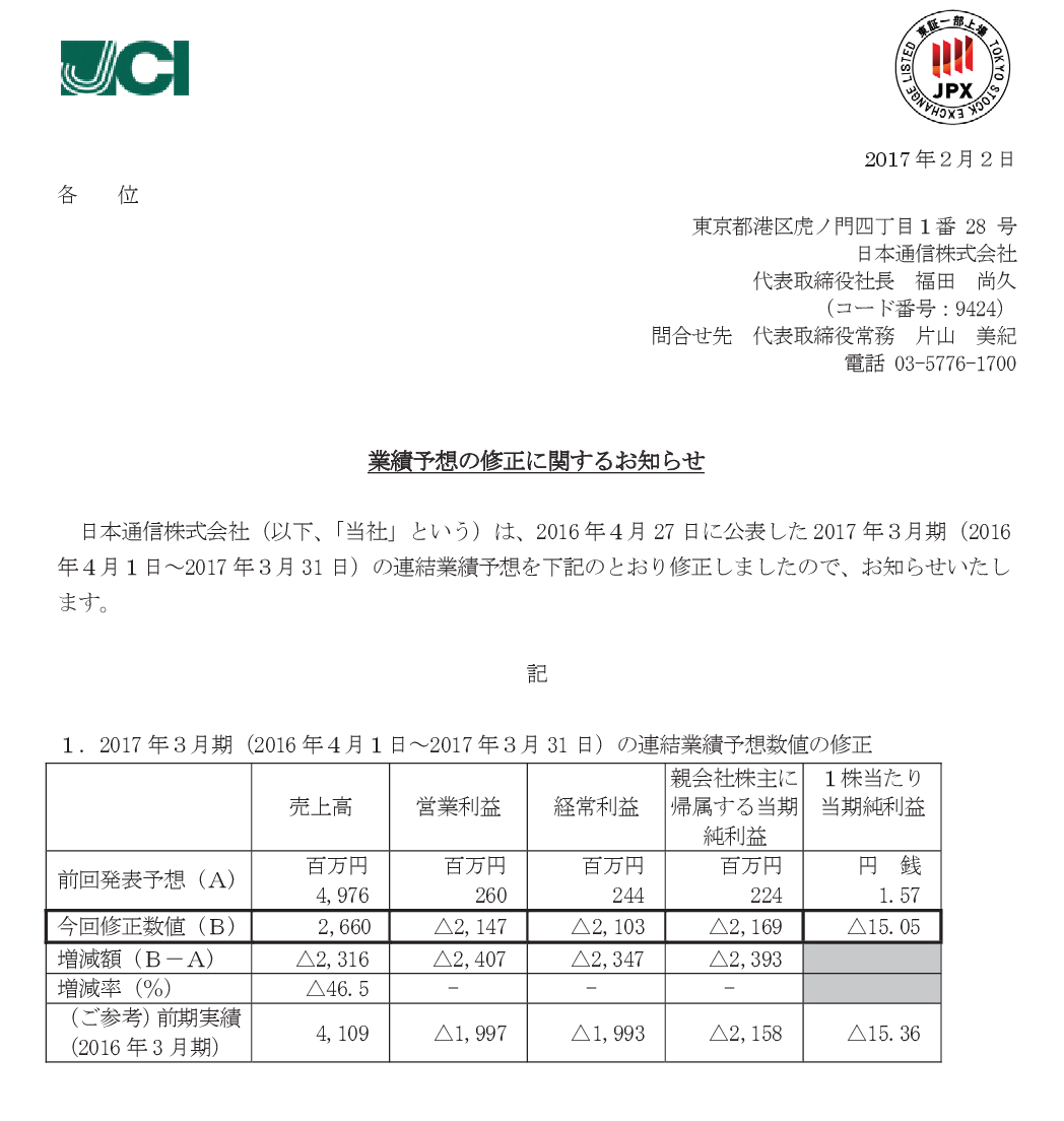 2017/02/02 18:20 日本通信 業績予想の修正に関するお知らせ