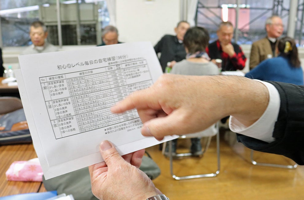 昔は50〜60代で始めるケースが多かったが、最近は70代で手術し、入門する人も少なくない。食道発声は体力や体調に依存するため、高齢になると発声が難しくなる。上級コースでは、身体への負担が少ない機械の発声法も学ぶのはそのためだ。