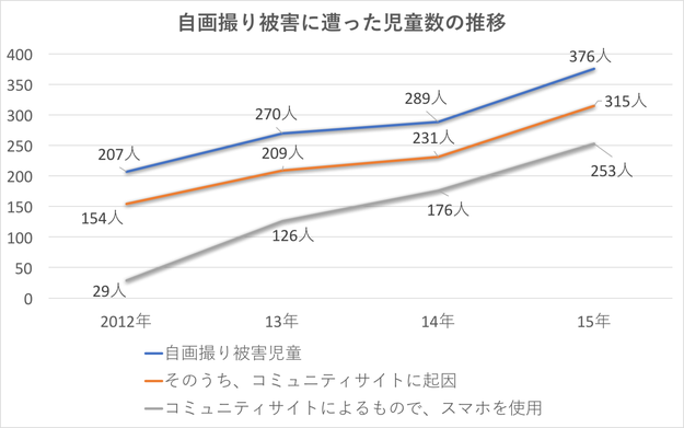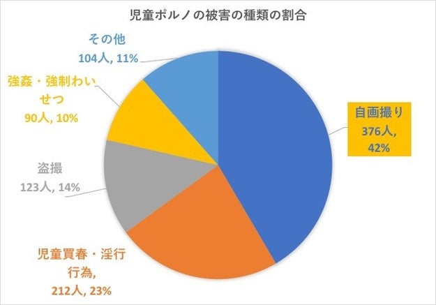2015年、警察庁が把握した児童ポルノの被害者数は905人。そのうち、種類別に見ると、自画撮り被害が最多で42%。376人が被害を受けていた。