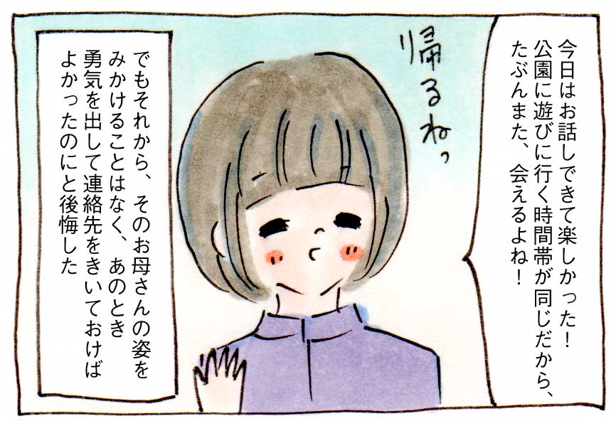 でもそれから、そのお母さんの姿をみかけることはなく、あのとき勇気を出して連絡先をきいておけばよかったと後悔しました。