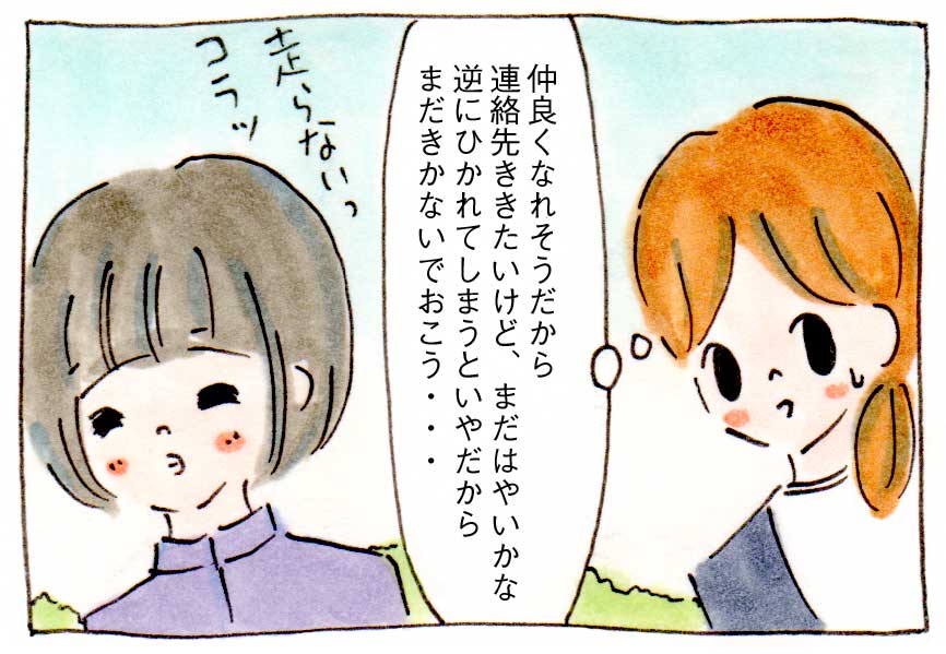仲良くなれそうだから連絡先をききたいと思いましたが、まだはやいかもしれないので、逆にひかれてしまうといやだと思い、きくのをやめました。