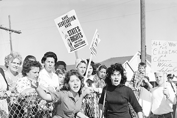 1960年11月15日、ルイジアナ州のウィリアム・フランツ小学校。白人専用だったが、裁判所が隔離をやめるように命じた。黒人の子どもが登校し始めて2日目の抗議活動。