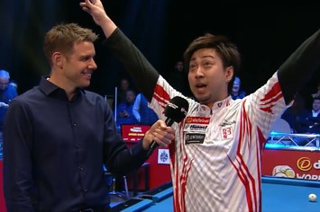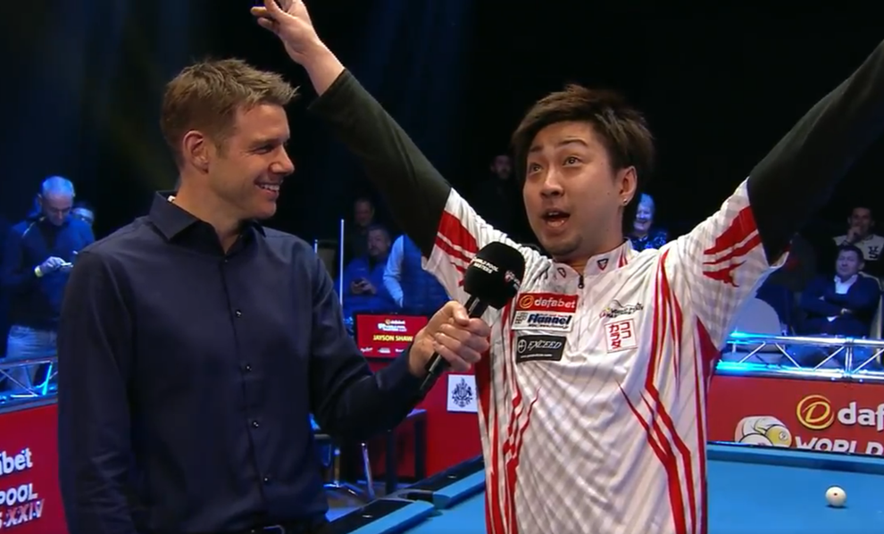 週末、ジブラルタルで開催されたビリヤードの世界選手権に出場した日本の大井直幸選手。レポーターは大井選手にマイクを向け、試合について英語で質問しました。