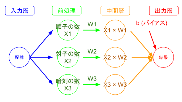 - 配牌を下図のように、かたちで分解し、それぞれの重みから「アガれる」か「アガれない」か出力します。