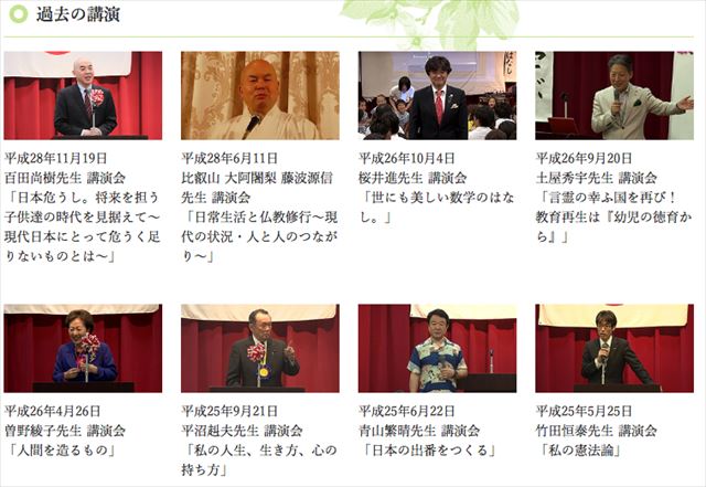 ▲塚本幼稚園で行われたこれまでの講演会の一部。百田尚樹氏、曾野綾子氏、青山繁晴氏、竹田恒泰氏など、右派の論客がズラリと並んでいる。どう見ても幼稚園児に聞かせるための講演ではない。