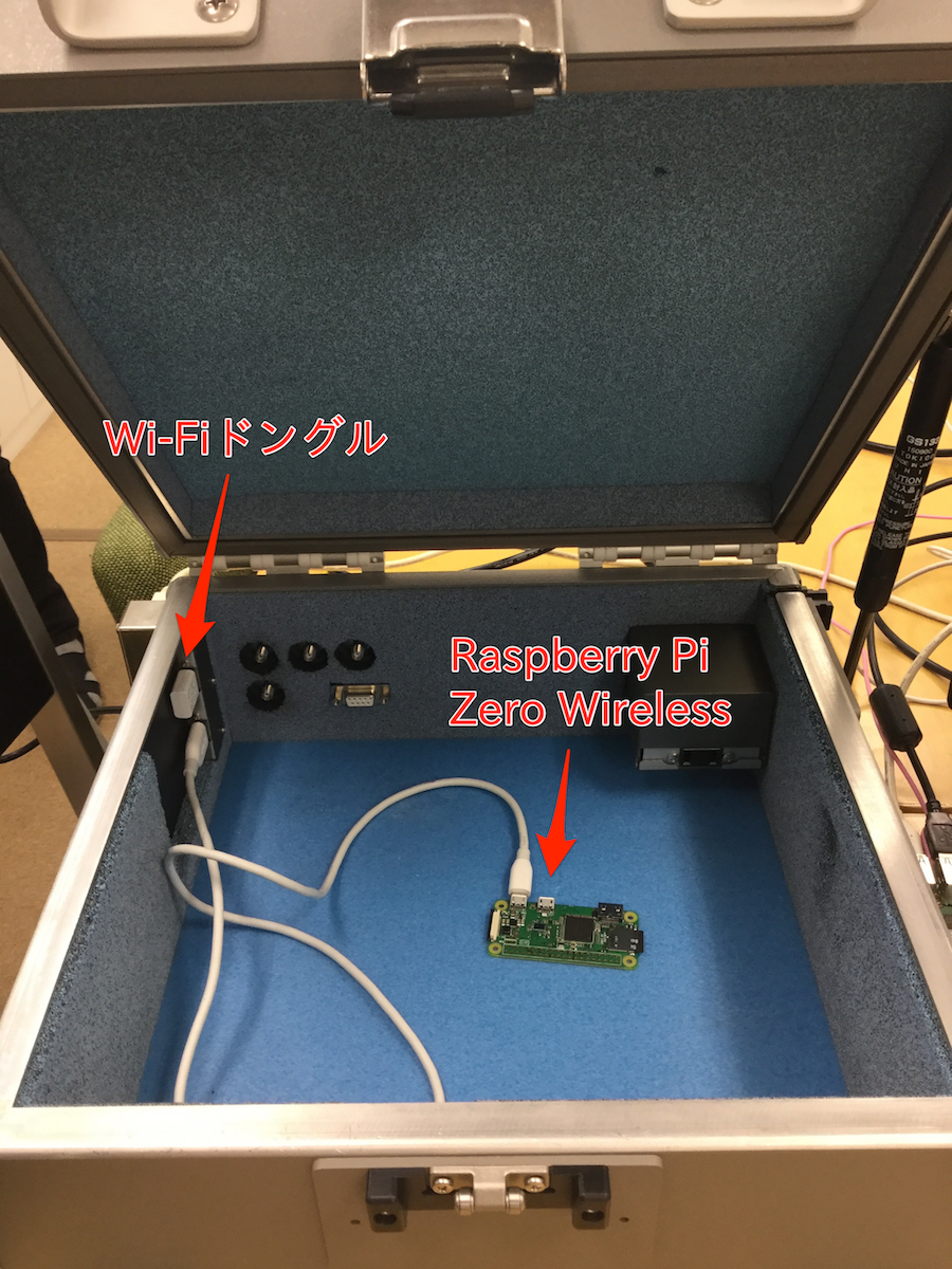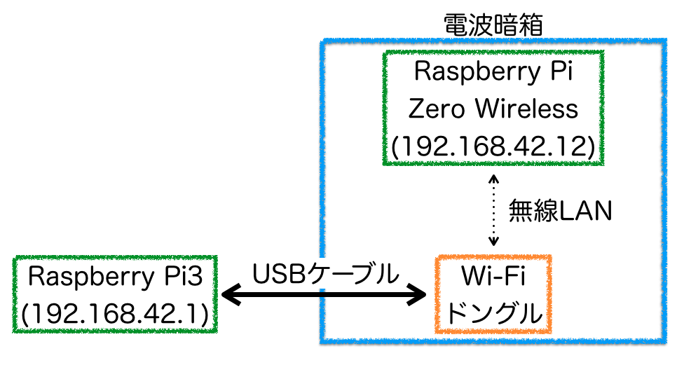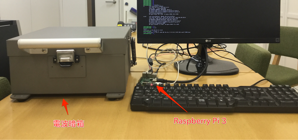 電波暗箱の中にあるRaspberry Pi Zero Wと外においてあるRaspberry Pi3で通信を試してみました。電波暗箱の中には、Raspberry Pi Zero Wと、Raspberry Pi3に有線でつながっている無線LANドングルが入っています。
