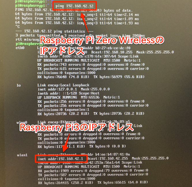 Raspberry Pi3からRaspberry Pi Zero WにPingを打って疎通を確認してみました。