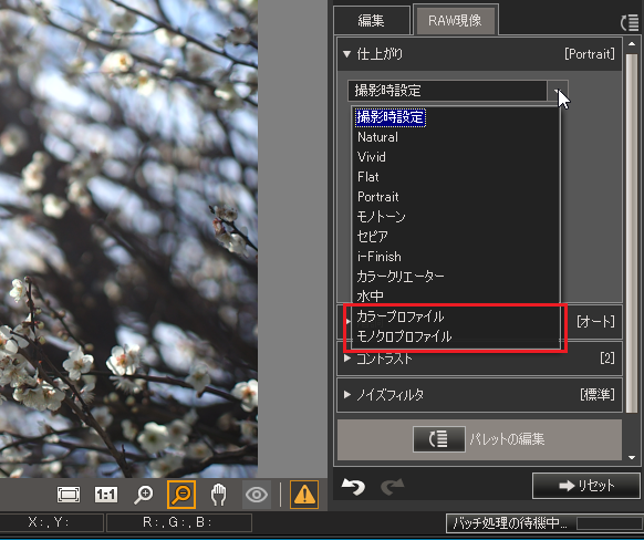 PEN-FまたはOM-D E-M1 Mark IIで撮影されたRAW画像を選択すると、「仕上がり」のドロップメニューの中に「モノクロ/カラープロファイル」の項目が現れます。^^; また、ライブラリ表示でフォルダー内にJpegとRAWの両ファイルがあると表示が煩雑になるので、フォルダー表示に変えてオプションの基本メニュー内にある「RAW・JPEGをまとめて表示(フォルダ管理時)」と「RAW画像を優先して表示」にチェックを入れた状態にすると便利です。