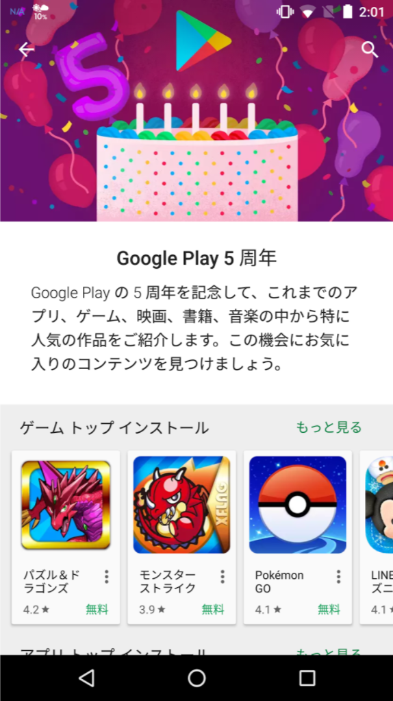ストアが 5 周年を迎えました。「Android マーケット」という名称で、アプリの配信プラットフォームとして始まりましたが、その後、音楽や映画、書籍などのコンテンツ拡大に伴い、Android でデジタルコンテンツを総合的にお楽しみいただくためのプラットフォームとして、
