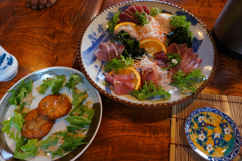 まず出てきたのがこちら、揚げたての甘鯛のさつま揚げとブリのたたきとイカのエンペラのお刺身。
