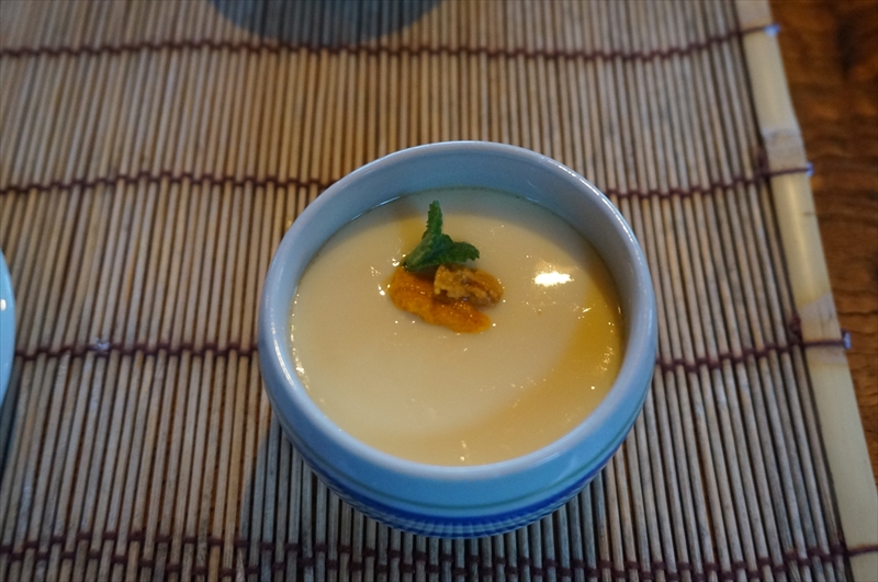 坂井シェフと考案した、ままかりの出汁で作った茶碗蒸しのウニ添え。