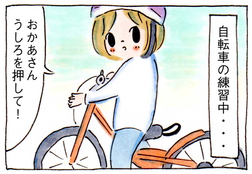 自転車の練習中、長女(6才)に、うしろを押してとせがまれます。