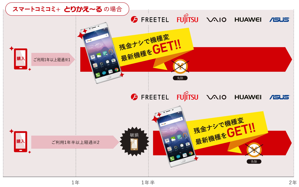 スマートコミコミ+の特長のひとつとして、割賦支払い中でも割賦支払い中の残債を支払うことなく好きな機種への機種変更ができる「とりかえ〜る」がある。FREETELでは、とりかえ〜るを「フリーテルなら画面が割れたスマホを2年間も使い続ける必要はありません。」と紹介しているが、とりかえ〜るによって現在利用中の機種の残債を支払うことなく「最新機種をGET!!」することができるのは、良品の場合は割賦支払から12カ月以上が、破損などがあった場合は18カ月間が経過して以降となる。