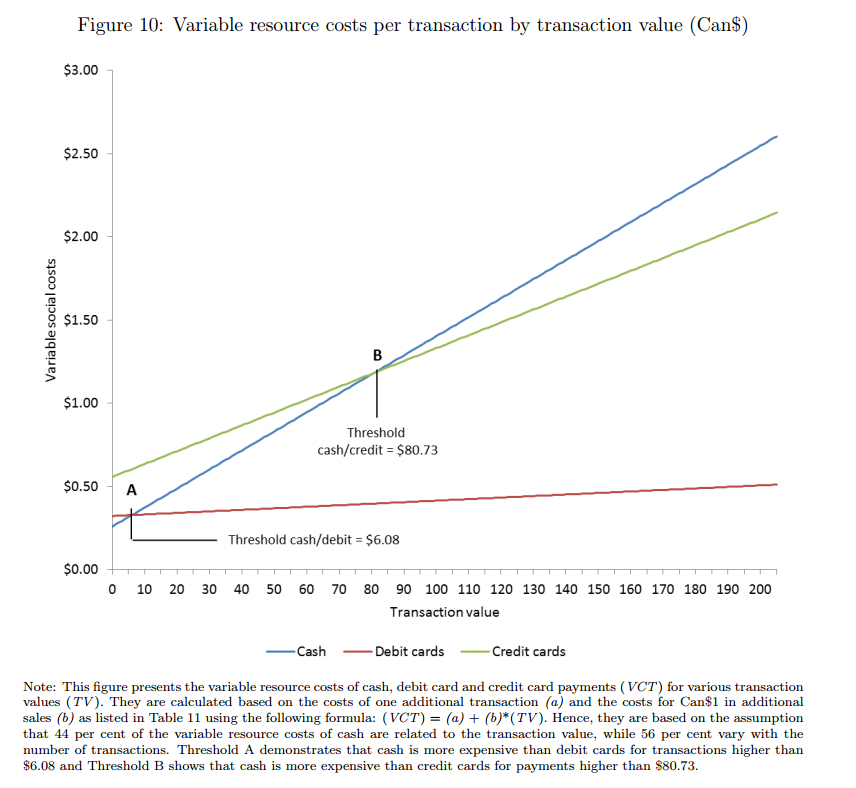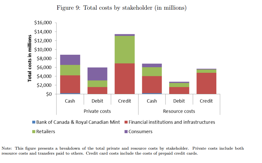 上記のPrivate Costsのパートを見ると、例えば社会的にはデビット取引が一番低いものの、消費者からするとクレジットカードに関して負うコストが一番低い、といった差異の表れが判明しています。