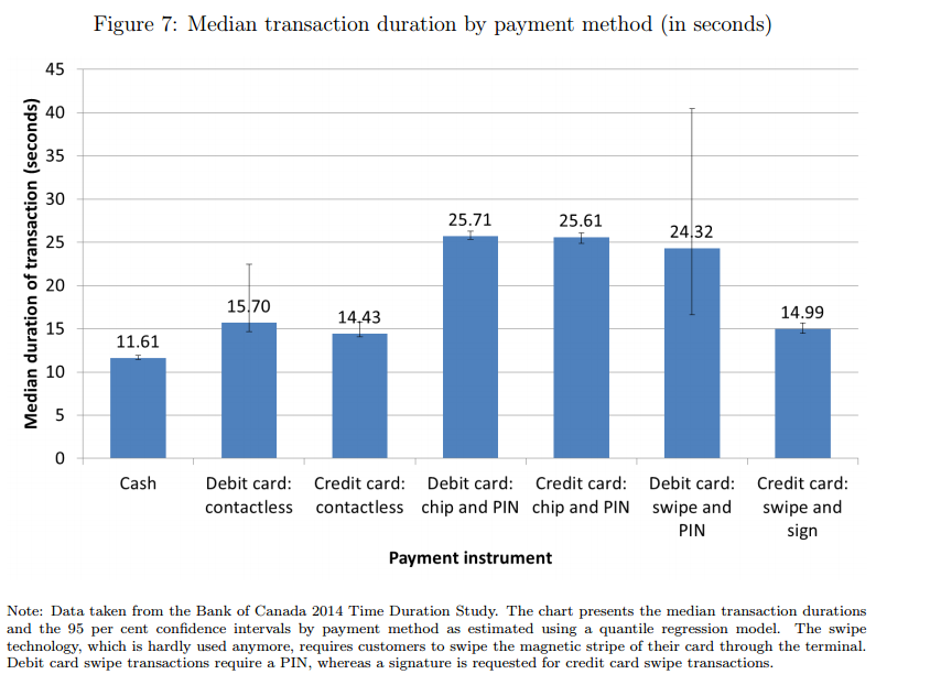 興味深いのは、例えば、それぞれの支払手段において、実際に消費者や商店が支払うコストの中には、カード支払ネットワークの費用に加えて、支払に要する時間が勘案されている点です。支払い所要時間を方法別にみたものはこちら。