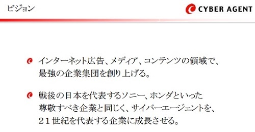 ベンチャーの経営理念でパッと思い浮かぶのがサイバーエージェントさんの「21世紀を代表する会社を創る」ですね。実はこのビジョン、2001年当時はちょっと違うものでした。