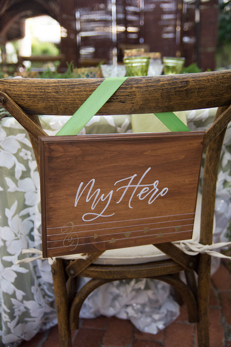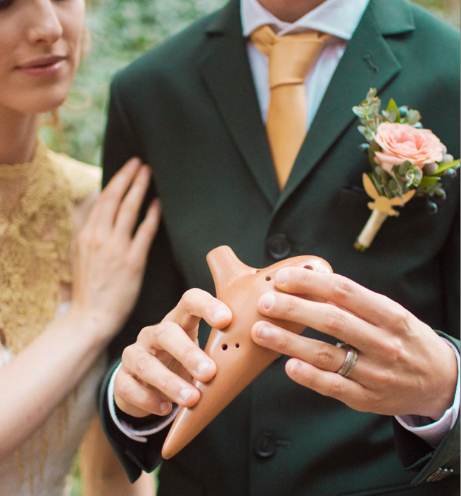 新郎はリンクを思わせるグリーンのスーツ、胸のブーケには画像ではわかりづらいですが時のオカリナでおなじみの妖精があしらわれています。新婦のヘッドドレスはゼルダを意識したもの。ロマンティックなドレスとよく似合っています。ウェディングケーキにはハイラルの盾のデコレーション、新郎の席には『my Hero』の文字と「時の歌」の楽譜入り。お客様が迷わぬようにトライフォースの席順案内版も用意されました。また新郎は木製のオカリナを披露。結婚指輪もトライフォースイメージのデザインをチョイスしました。