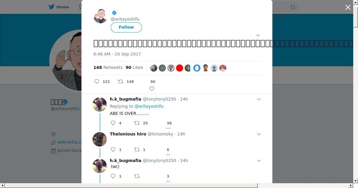 取得元URL: https://twitter.com:443/aritayoshifu/status/910501006718394369