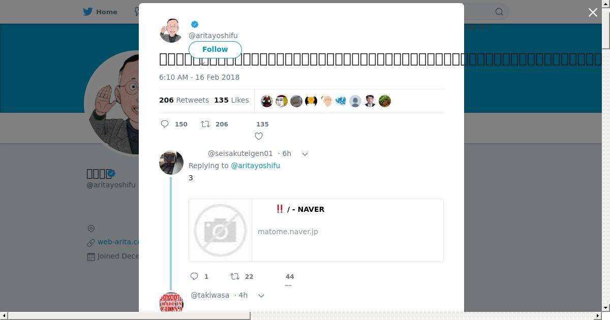 取得元URL: https://twitter.com:443/aritayoshifu/status/964502302085099520