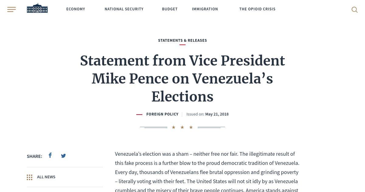 https://www.whitehouse.gov:443/briefings-statements/statement-vice-president-mike-pence-venezuelas-elections/