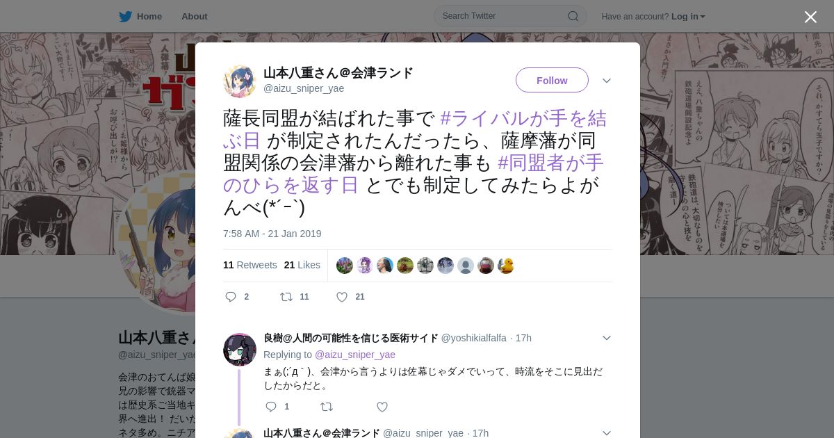 取得元URL: https://twitter.com:443/aizu_sniper_yae/status/1087378961384914945