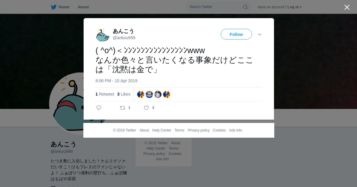 取得元URL: https://twitter.com:443/ankou999/status/1116175696890437633