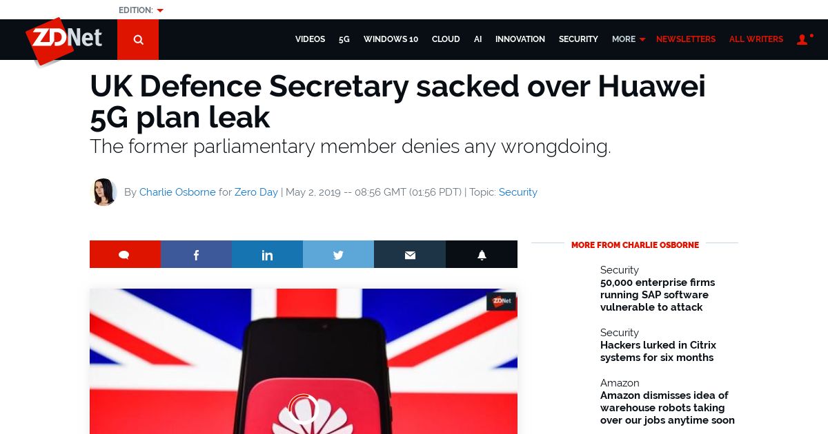 https://www.zdnet.com:443/article/uk-defence-secretary-sacked-over-huawei-5g-plan-leak/
