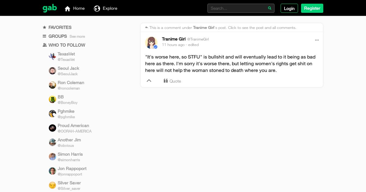 http://gab.com/TranimeGirl/posts/WG15aEQzY0N0KzdCR3hBSWtWWUY4QT09