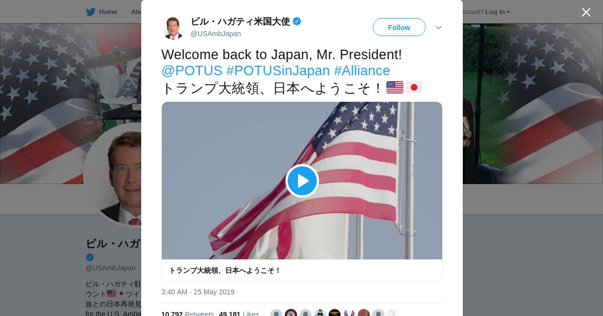 取得元URL: https://twitter.com:443/USAmbJapan/status/1132234856329568256