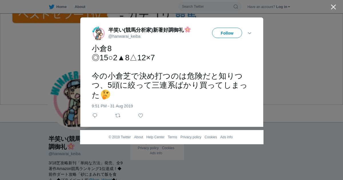 https://twitter.com:443/hanwarai_keiba/status/1168023654329765890