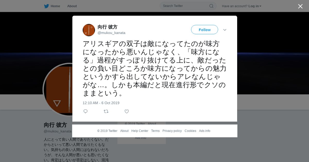 取得元URL: https://twitter.com:443/mukou_kanata/status/1180742082354266113