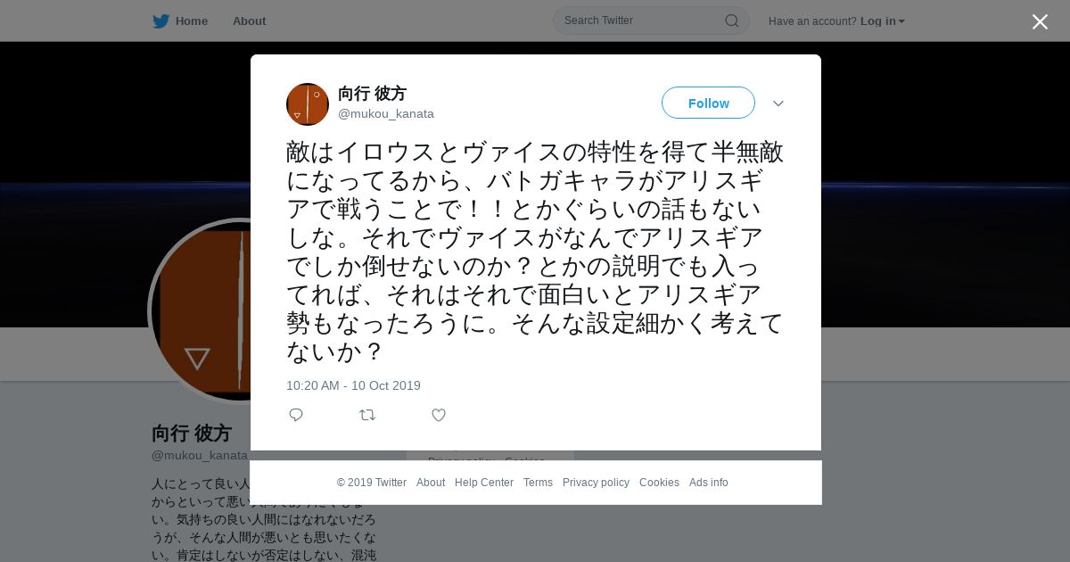 取得元URL: https://twitter.com:443/mukou_kanata/status/1182345136367235072