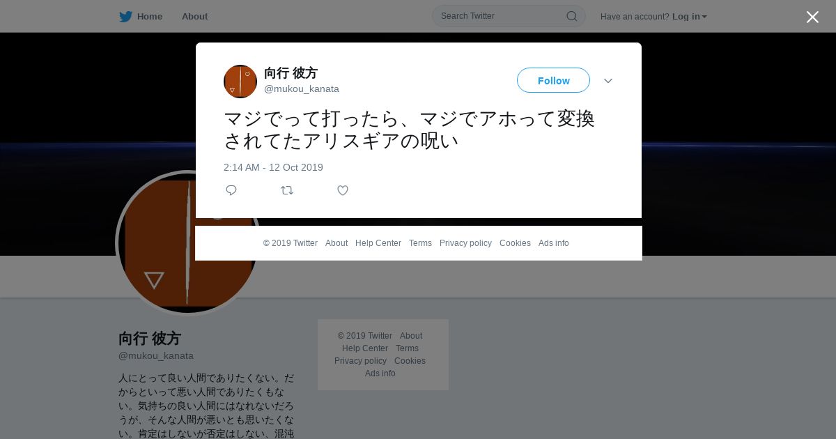 取得元URL: https://twitter.com:443/mukou_kanata/status/1182947709847621632