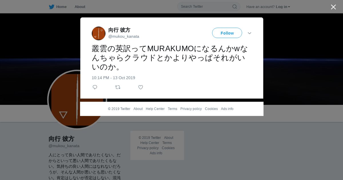 取得元URL: https://twitter.com:443/mukou_kanata/status/1183612105309581312