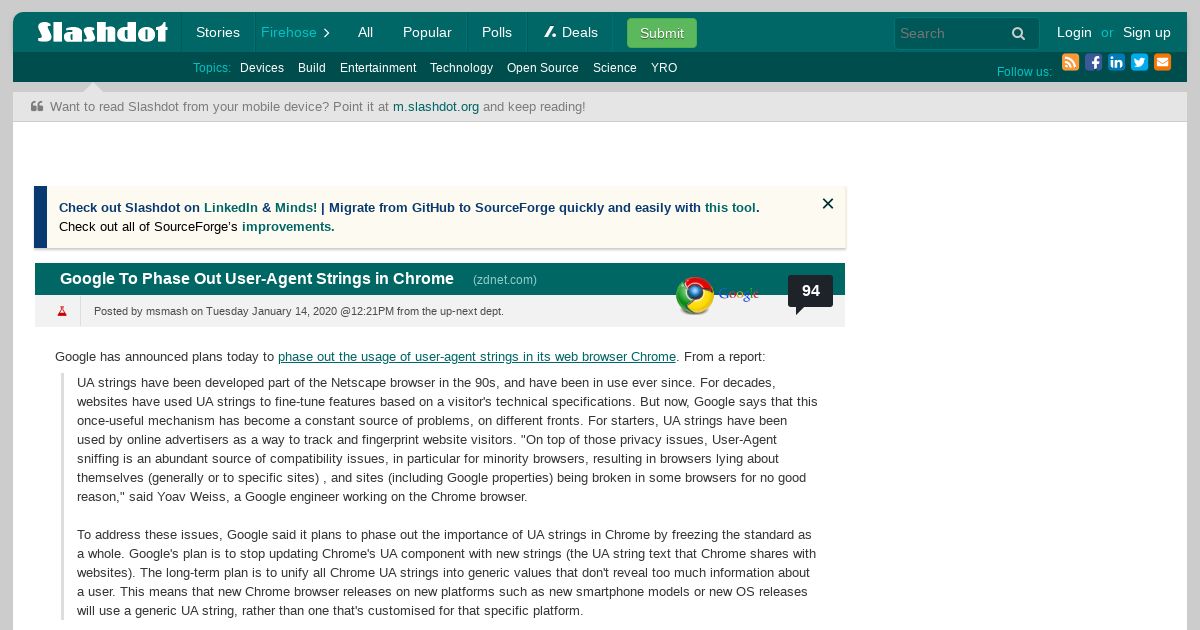 https://tech.slashdot.org:443/story/20/01/14/1642256/google-to-phase-out-user-agent-strings-in-chrome