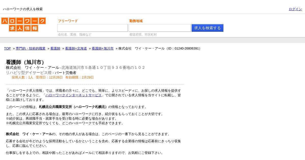 https://www.hellowork.careers:443/%E6%A0%AA%E5%BC%8F%E4%BC%9A%E7%A4%BE%E3%80%80%E3%83%AF%E3%82%A4%E3%83%BB%E3%82%B1%E3%83%BC%E3%83%BB%E3%82%A2%E3%83%BC%E3%83%AB%E3%81%A7%E3%81%AE%E7%9C%8B%E8%AD%B7%E5%B8%AB%EF%BC%88%E6%97%AD%E5%B7%9D%E5%B8%82%EF%BC%89%E3%81%AE%E3%83%8F%E3%83%AD%E3%83%BC%E3%83%AF%E3%83%BC%E3%82%AF%E6%B1%82%E4%BA%BA%E6%83%85%E5%A0%B1%EF%BC%88%E5%8C%97%E6%B5%B7%E9%81%93%E6%97%AD%E5%B7%9D%E5%B8%82%EF%BC%95%E6%9D%A1%E9%80%9A%EF%BC%91%EF%BC%90%E4%B8%81%E7%9B%AE%EF%BC%99%EF%BC%93%EF%BC%96%E7%95%AA%E5%9C%B0%E3%81%AE%EF%BC%91%EF%BC%89-%2001240-26806391/