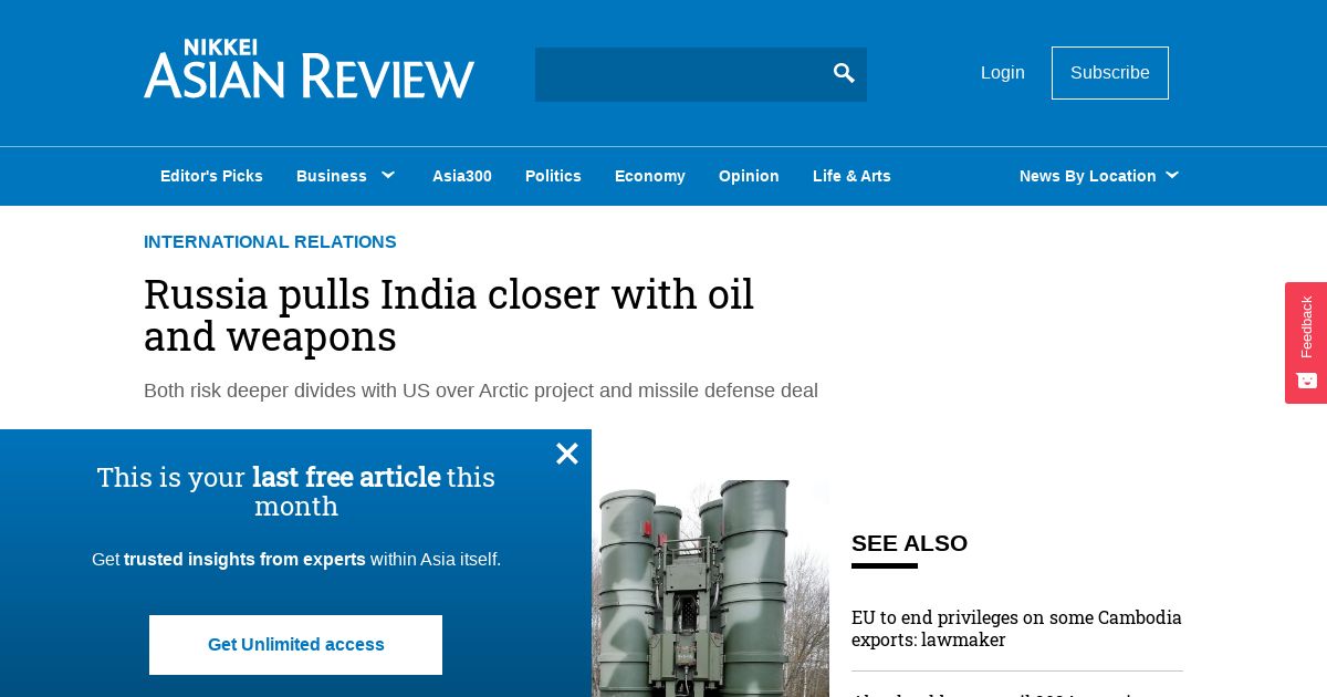 取得元URL: https://asia.nikkei.com:443/Politics/International-relations/Russia-pulls-India-closer-with-oil-and-weapons?utm_source=paid.outbrain.com&utm_campaign=BA%20JPN&utm_medium=referral&utm_content=E15-1&dicbo=v1-dc9d5ec665621ea7c9b669310cecbe0d-00280e9c9208103b82992e13a5e43683ac-gu2wknddgmzdqljsgi2tcljumi4wkljyhe2dmljwmqydgnbtmu3tezbzmi
