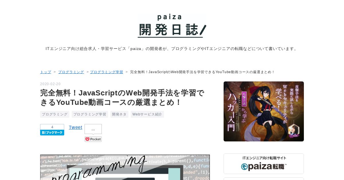 https://paiza.hatenablog.com:443/entry/2020/02/20/%E5%AE%8C%E5%85%A8%E7%84%A1%E6%96%99%EF%BC%81JavaScript%E3%81%AEWeb%E9%96%8B%E7%99%BA%E6%89%8B%E6%B3%95%E3%82%92%E5%AD%A6%E7%BF%92%E3%81%A7%E3%81%8D%E3%82%8BYouTube%E5%8B%95%E7%94%BB%E3%82%B3%E3%83%BC