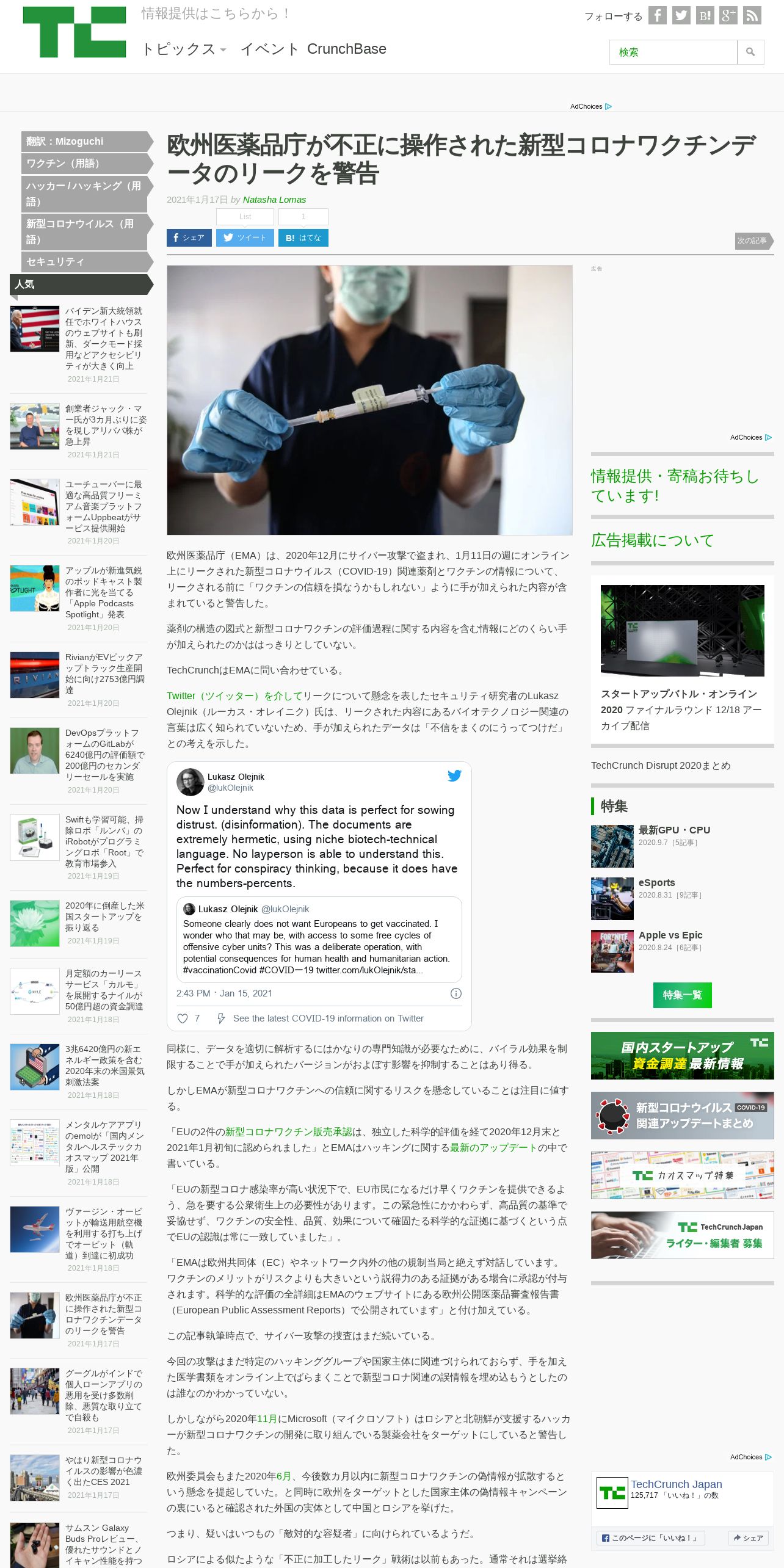 https://jp.techcrunch.com:443/2021/01/17/2021-01-15-ema-warns-over-doctored-covid-19-vaccine-data-hacked-and-leaked-online/