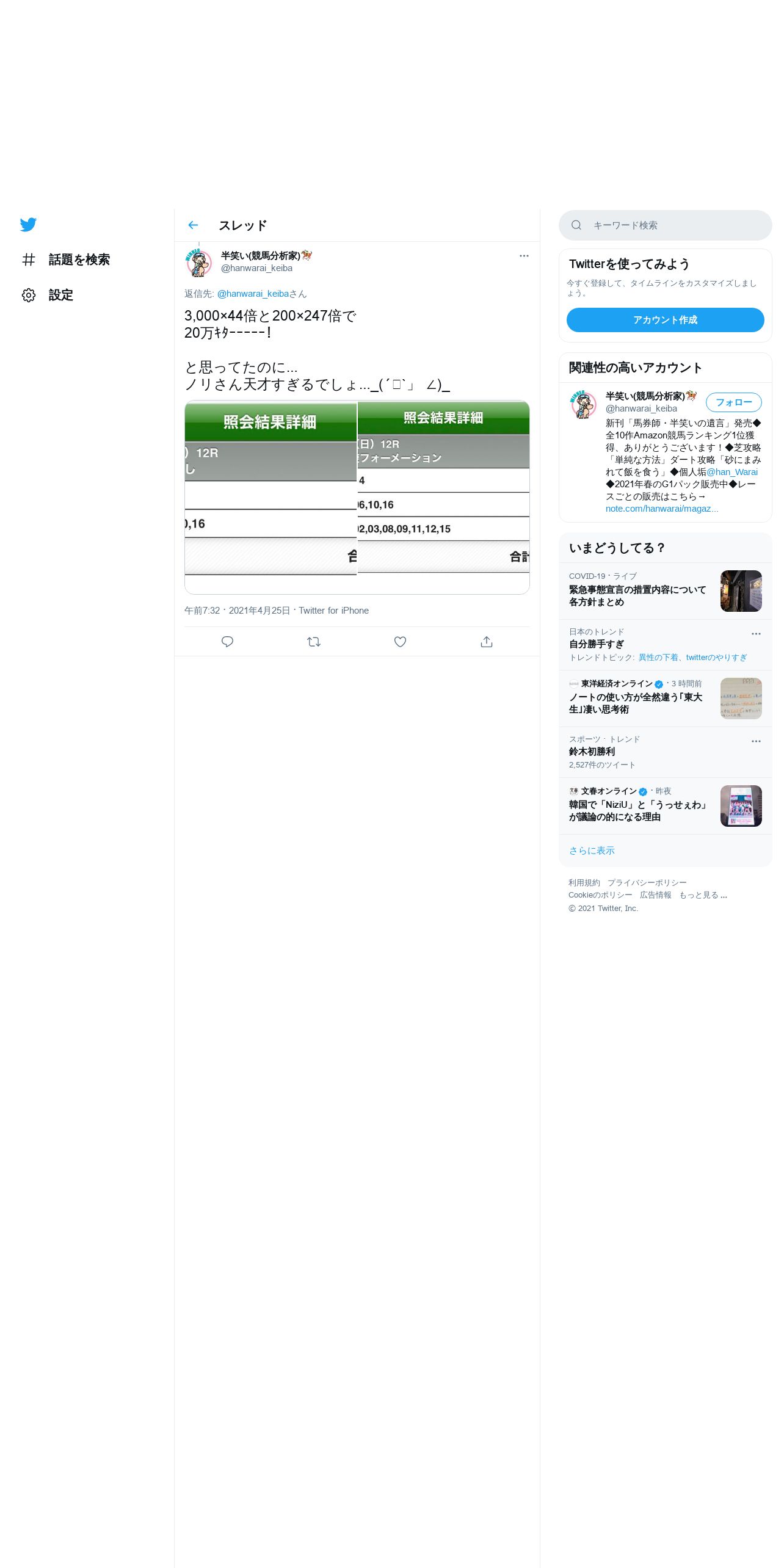 取得元URL: https://twitter.com:443/hanwarai_keiba/status/1386221511514591233