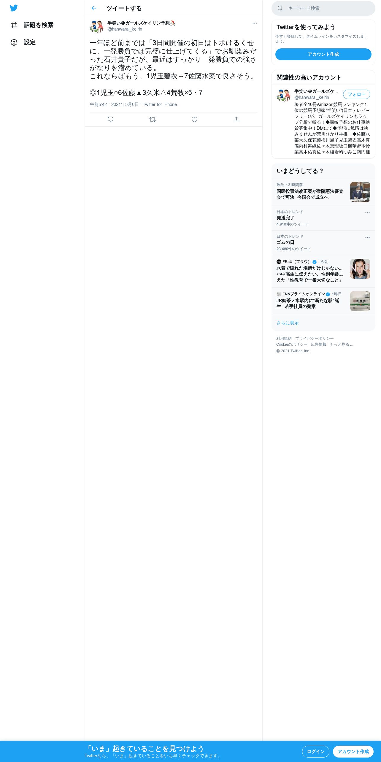 取得元URL: https://twitter.com:443/hanwarai_keirin/status/1390180262860918786
