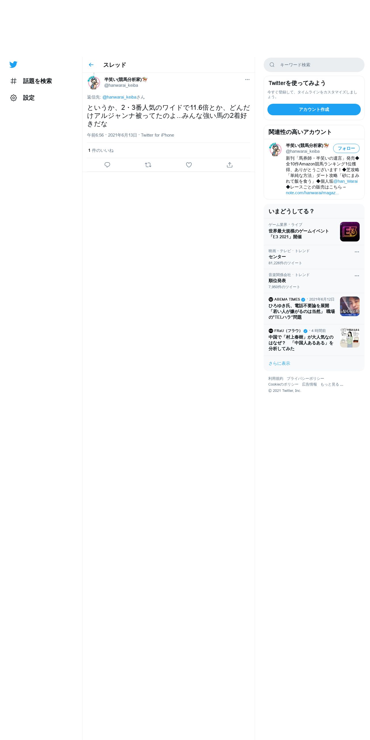 https://twitter.com:443/hanwarai_keiba/status/1403969597309538307