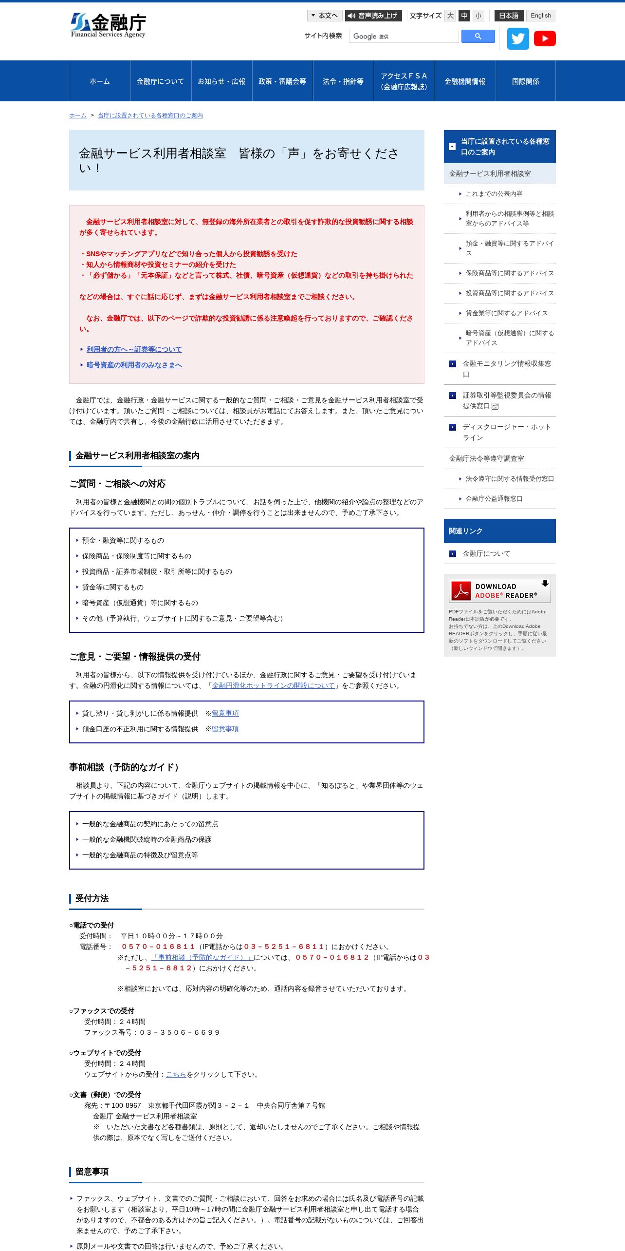 https://www.fsa.go.jp:443/receipt/soudansitu/index.html