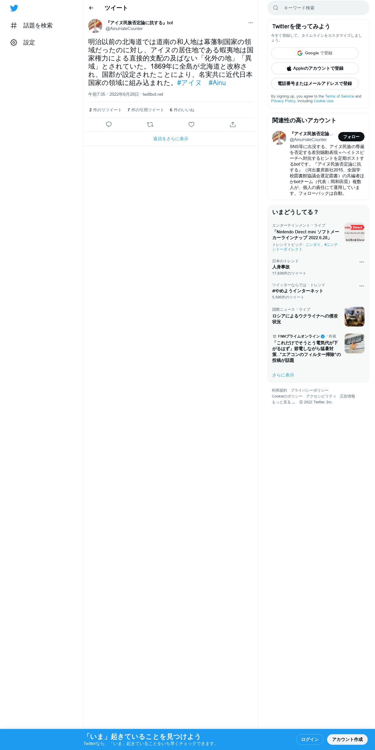 https://twitter.com:443/AinuHateCounter/status/1541686827287191552
