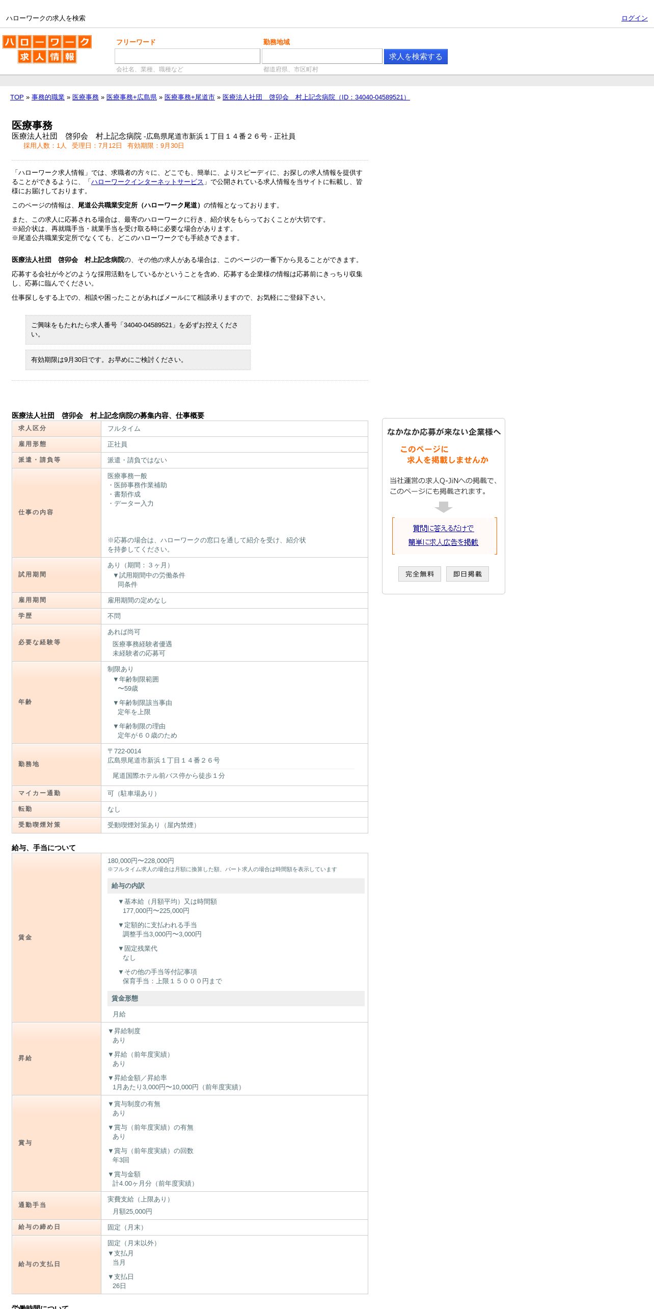 https://www.hellowork.careers:443/%E5%8C%BB%E7%99%82%E6%B3%95%E4%BA%BA%E7%A4%BE%E5%9B%A3%E3%80%80%E5%95%93%E5%8D%AF%E4%BC%9A%E3%80%80%E6%9D%91%E4%B8%8A%E8%A8%98%E5%BF%B5%E7%97%85%E9%99%A2%E3%81%A7%E3%81%AE%E5%8C%BB%E7%99%82%E4%BA%8B%E5%8B%99%E3%81%AE%E3%83%8F%E3%83%AD%E3%83%BC%E3%83%AF%E3%83%BC%E3%82%AF%E6%B1%82%E4%BA%BA%E6%83%85%E5%A0%B1%EF%BC%88%E5%BA%83%E5%B3%B6%E7%9C%8C%E5%B0%BE%E9%81%93%E5%B8%82%E6%96%B0%E6%B5%9C%EF%BC%91%E4%B8%81%E7%9B%AE%EF%BC%91%EF%BC%94%E7%95%AA%EF%BC%92%EF%BC%96%E5%8F%B7%EF%BC%89-%2034040-04589521/