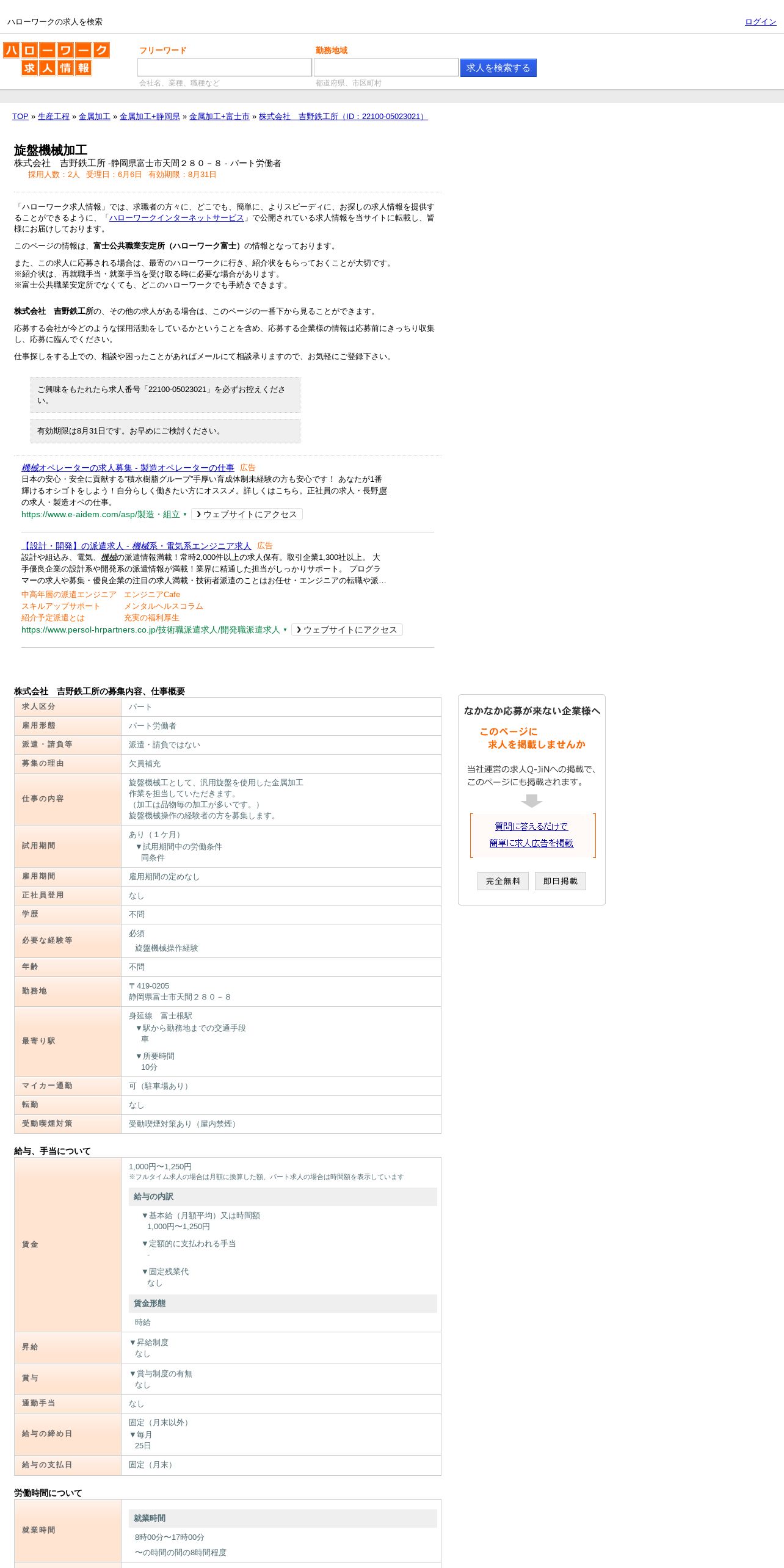 https://www.hellowork.careers:443/%E6%A0%AA%E5%BC%8F%E4%BC%9A%E7%A4%BE%E3%80%80%E5%90%89%E9%87%8E%E9%89%84%E5%B7%A5%E6%89%80%E3%81%A7%E3%81%AE%E6%97%8B%E7%9B%A4%E6%A9%9F%E6%A2%B0%E5%8A%A0%E5%B7%A5%E3%81%AE%E3%83%8F%E3%83%AD%E3%83%BC%E3%83%AF%E3%83%BC%E3%82%AF%E6%B1%82%E4%BA%BA%E6%83%85%E5%A0%B1%EF%BC%88%E5%AF%8C%E5%A3%AB%E5%B8%82%EF%BC%89-%2022100-05023021/