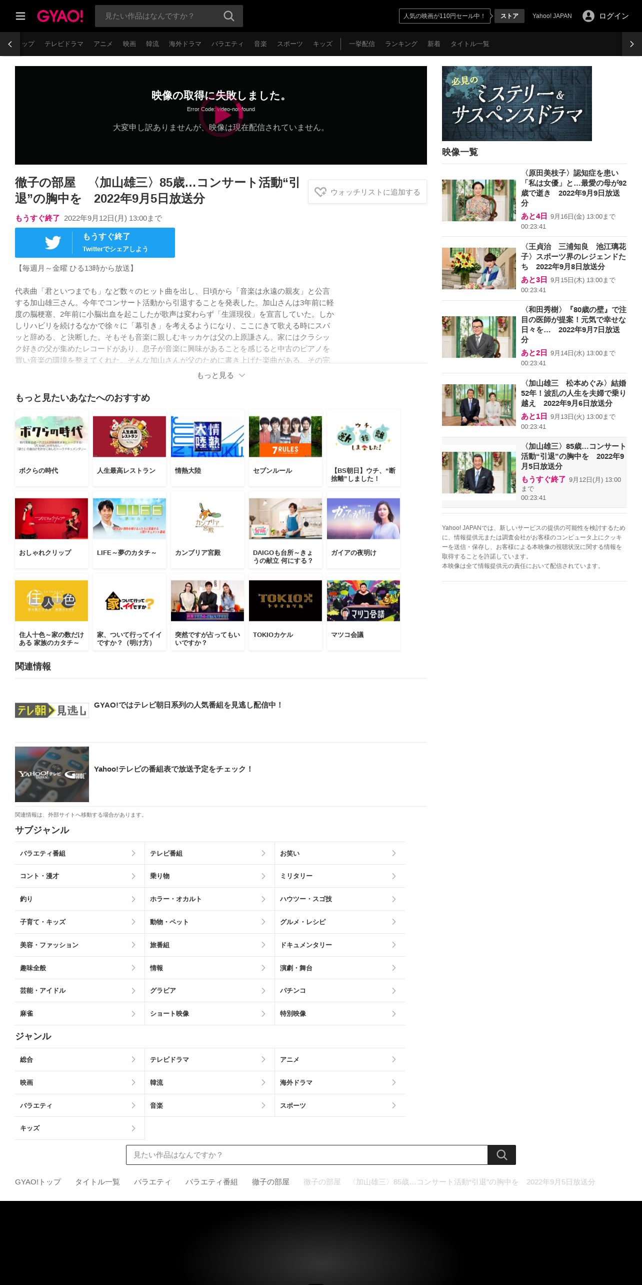 https://gyao.yahoo.co.jp:443/episode/%E5%BE%B9%E5%AD%90%E3%81%AE%E9%83%A8%E5%B1%8B%E3%80%80%E3%80%88%E5%8A%A0%E5%B1%B1%E9%9B%84%E4%B8%89%E3%80%8985%E6%AD%B3%E2%80%A6%E3%82%B3%E3%83%B3%E3%82%B5%E3%83%BC%E3%83%88%E6%B4%BB%E5%8B%95%E2%80%9C%E5%BC%95%E9%80%80%E2%80%9D%E3%81%AE%E8%83%B8%E4%B8%AD%E3%82%92%E3%80%802022%E5%B9%B49%E6%9C%885%E6%97%A5%E6%94%BE%E9%80%81%E5%88%86/6304948b-d2f9-4c2f-9419-7861d0efb1bb