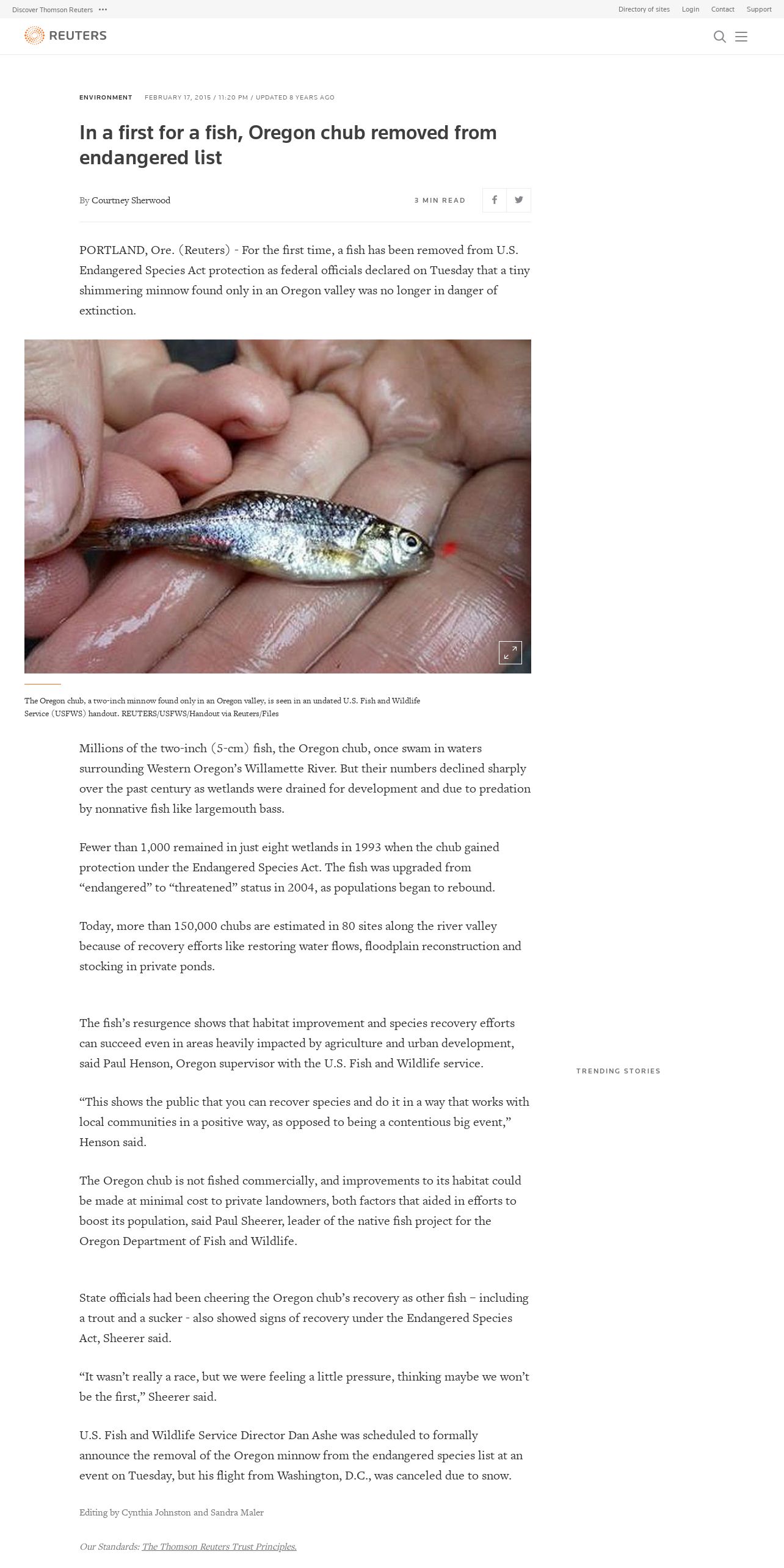 取得元URL: https://www.reuters.com:443/article/us-usa-wildlife-minnow-idUSKBN0LL29O20150217